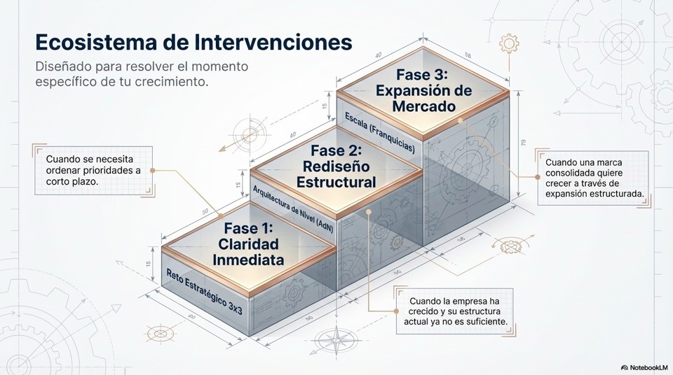 Cada intervención está diseñada para resolver un momento específico del crecimiento empresarial.
